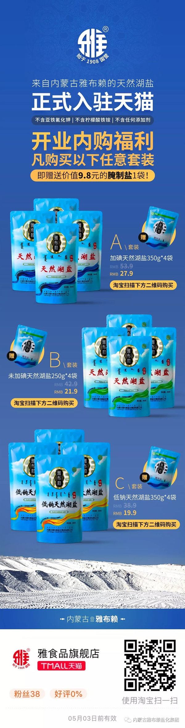 电商公司通过京东的层层严格审核,雅盐天猫旗舰店于4月1日隆重开业。自此,雅盐食用盐、洗涤盐系列8个单品全部上线销售,分别为:大青盐(320g)、低钠天然湖盐(350g)、未加碘天然湖盐(250g)、天然湖盐(350g)、腌制盐(400g)、精制盐(400g、2500g)、果蔬洗涤盐(320g)。 现在,消费者只需在淘宝输入“雅布赖盐”、“雅食品旗舰店”或使用淘宝扫描上图二维码,即可找到由星空体育·(中国)官方网站-XINGKONG SPORTS
