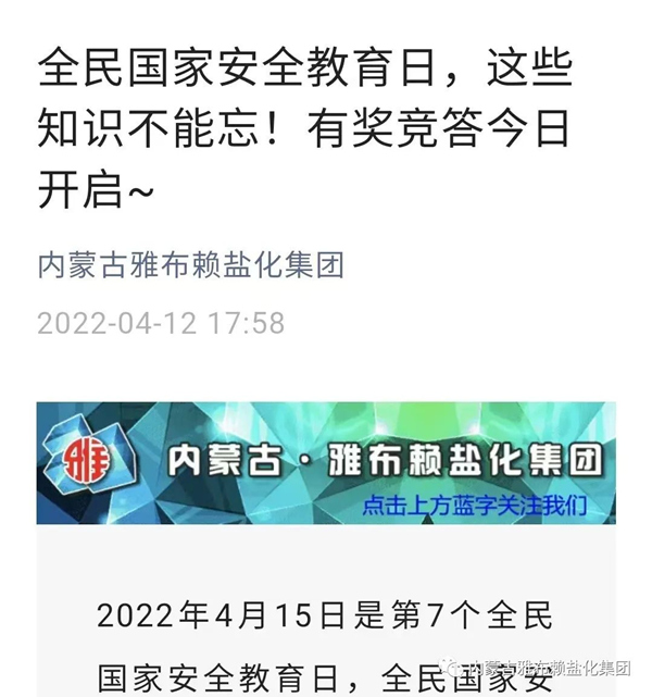 为确保活动取得实效,公司围绕“树牢总体国家安全观,感悟新时代国家安全成就,为迎接党的二十大胜利召开营造良好氛围”这一主题,利用公司微信公众号、微信群、网站、横幅标语、宣传挂图等多种宣传形式进行了广泛深入的国家安全宣传教育活动。并组织党员、员工积极参加阿拉善盟“全民国家安全教育日”网上知识竞答活动,引导党员员工树立总体国家安全观,提升自身安全意识和保密意识。