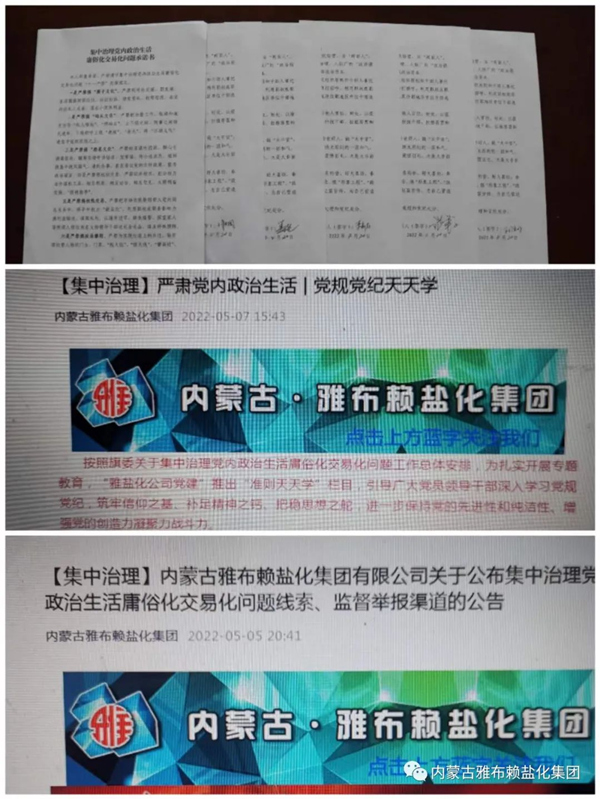 自党内政治生活庸俗化交易化问题集中治理工作启动以来,雅盐化集团公司党委高度重视,认真贯彻落实自治区党委、盟委、旗委相关部署要求,扎实稳步推进各项工作任务落实。